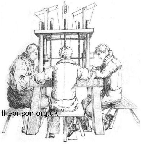 In October 1815, I again visited the gaol; and a more interesting scene I never witnessed . The prison is now divided into two parts; the one appropriated to adults, the other to children. They are wholly separated . Instead of lewd conversation, blasphemy, and the dangerous repetition of contrivances to do ill, the children are now improved in habits of industry, and hear only lessons of virtue and religion. When I entered their apartment, I heard no noise, but the buzzing of a manufactory; and saw their little countenances, not depressed and degraded, but placid and cheerful. Mr. Tatnal had selected an employment suitable for every person. He had procured, from Birmingham, pins to be headed, and in this occupation they were all actively employed . The boys, on an average, earn about two shillings per week, but when they first begin, from eight pence to one shilling. One quarter of their earnings is paid to them weekly, another quarter is kept till they are liberated, and the remaining half is applied in payment of expenses. I caused a small drawing of the Machine to be made, from which the annexed plate is engraved.
