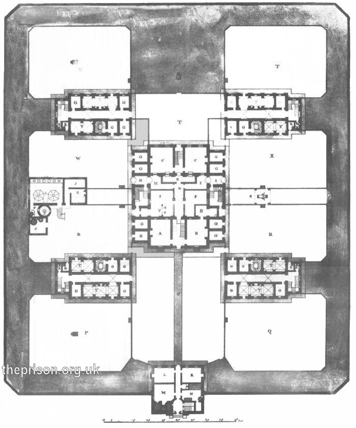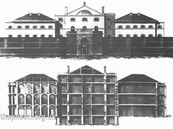 The new prison comprised six blocks surrounded by a strong wall. The entrance block included the keeper's office, committee room, brewhouse and bath-house, all attached to the outer wall. There were three court yards for the keeper, for the female felons to the left and the female penitentiaries to the right. In the centre block were the keeper's quarters, prisoners' visiting rooms, debtors' day rooms and a number of single working cells. Above them on the first floor were the chapel, the cells for condemned and refractory prisoners, the debtors' sleeping rooms and single sleeping cells. At each corner of the centre block, connected to it by cast-iron bridges, were four smaller blocks with single cells for working and sleeping. There were seven other court yards, allowing each class of prisoner to be kept separate. In the corner of one yard was a manufactory. Store rooms and water closets located on each stairway. There was also an infirmary.