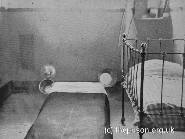 The bedding is of two different kinds, for the infirmary and the ordinary cells. The infirmary bedding consists of blue and white check coverlets or counterpanes, such as are used in hospitals in the metropolis; the sheets and pillow-cases are made of blue striped calico; the blankets are of substantial quality, white and clear in appearance, bordered with red stripes. The ordinary bedding for the cells consists of a hammock made of strong canvas, a rug, and a blanket, the latter being similar to that used in the infirmary, with sheets and pillow-case made of a coarse brown material, termed "Forfar sheeting." The bed is made of canvas stuffed with coir fibre.
