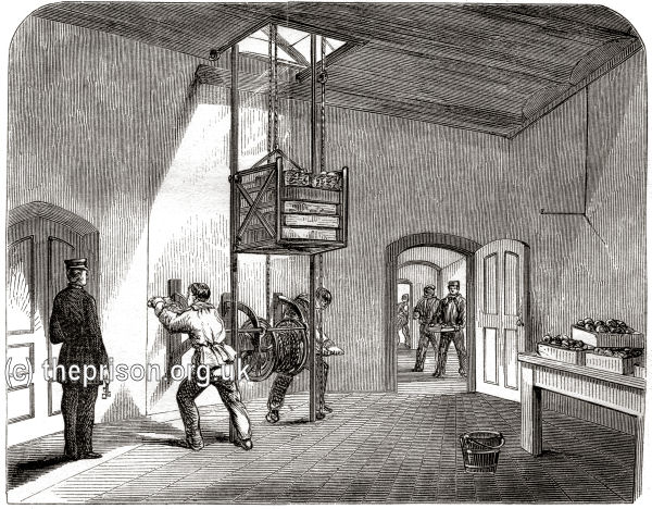 There are two skylights in the flooring of the central hall, 4 ft. 6 in, wide, by 6 feet long, consisting of very thick glass, supported on iron bars, giving light to the kitchen beneath. There is also a trap with a lifting machine on either side of the hall, between corridors A and B, and corridors C and D, communicating with the kitchen, by which trays of provisions are hoisted up on cradles to the different cells.