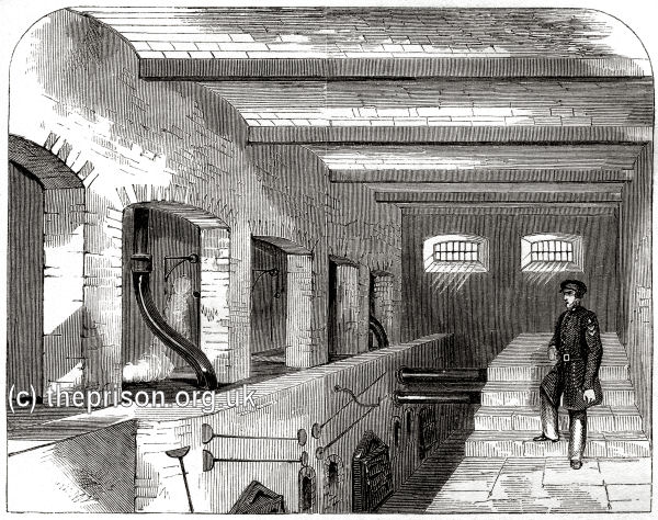 We then proceeded along the hall of the reception ward. At the farther extremity, before we reached the cells, we observed a narrow metal grating extending across from the one side of the floor to the other, which contained hot-air pipes. "This hot-air flue," said the chief warder, "extends along the centre of the reception ward, and gives warmth to the various cells."