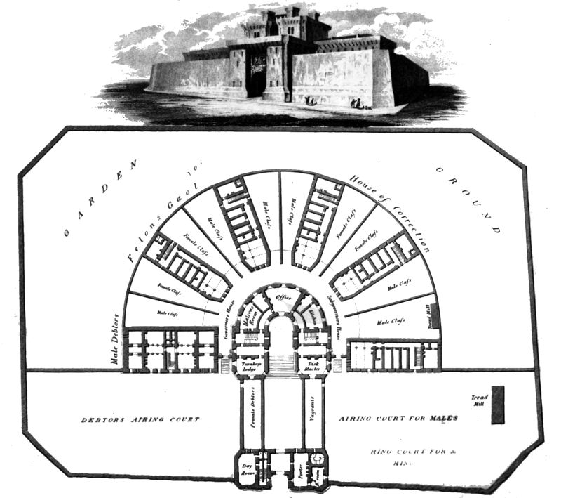 This massive building is enclosed by a thick wall, twenty-five feet in height above the inner courts. The entrance is by a strong tower on the west side, in which is an arched gateway, fourteen feet in height. Above the outer entrance is a large stone, on which it is proposed to cut the arms of the town. Two ponderous gates are to secure this entrance. Between them is the door of the porter's lodge; but he can speak to persons wanting admittance through a window on the outside. Apartments above may be used for prisoners detained in default of bail, and other purposes. The opposite side may probably be appropriated for the reception of vagrants, &c.
