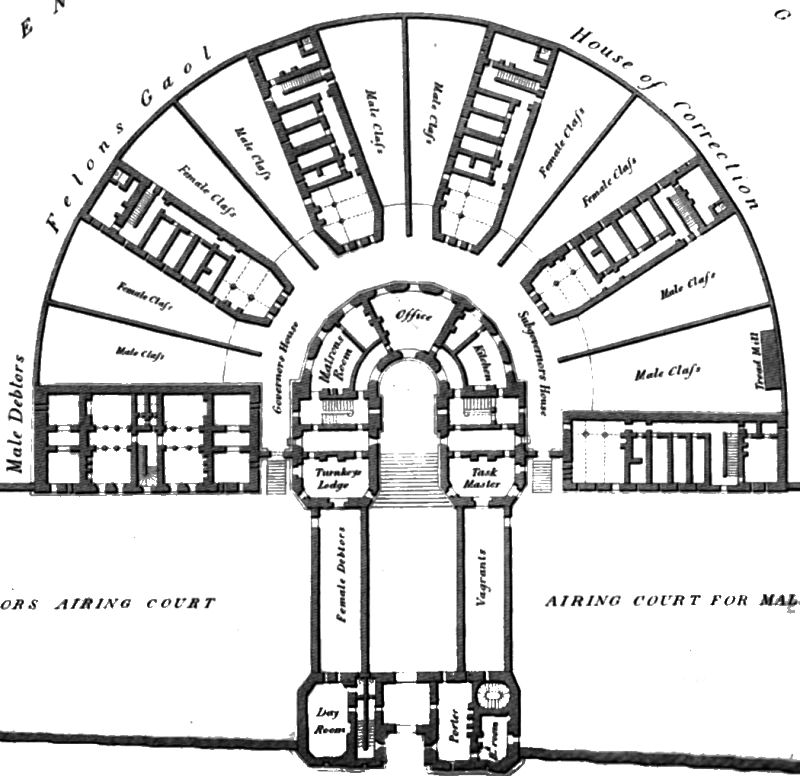 According to the original plan, these prisons were to consist of six radiating wings; but the commissioners have resolved to build only five at present. People, in comparing the old and new prisons, are struck by the disproportioned magnitude of the latter, without reflecting on the greater space requisite for the improved system of prison discipline, and the classification actually required by act of parliament. Fifty prisoners, if properly divided, may require as much room as a hundred; as a particular ward may be occupied by four or five prisoners, though capable of accommodating above twice the number. Besides, a considerable part of the buildings will be required for persons committed to the house of correction. The old "house of correction is calculated to hold thirty-two persons; yet, at one time, it has contained forty. Six or seven persons have been obliged to sleep in one bed!" Should the sixth wing not be wanted, about £3000 of the public money will be saved.