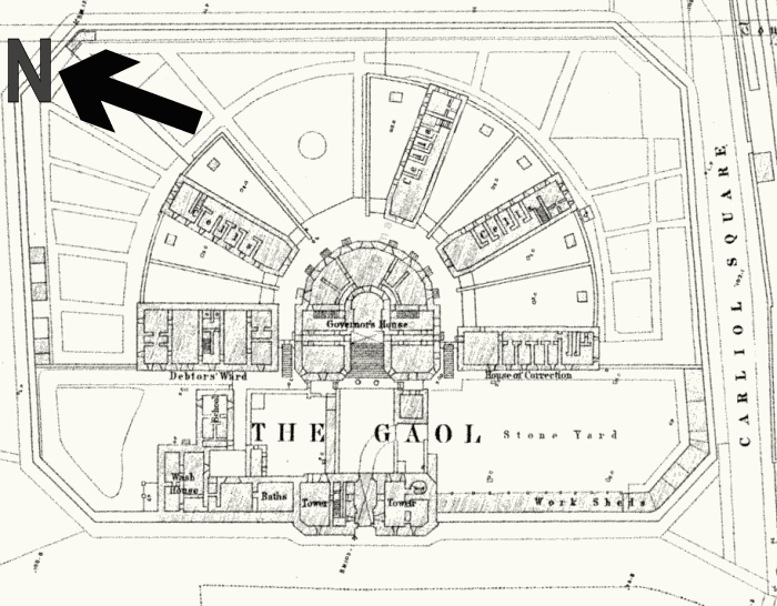 In 1828, a combined Town Gaol and House of Correction were erected on Carliol Square, Newcastle, replacing the existing Newgate, Castle Keep and Moot Hall prisons. The building was designed by John Dobson and adopted the then popular radial layout, with cell wings radiating from, though not connected to, the central governor's house,