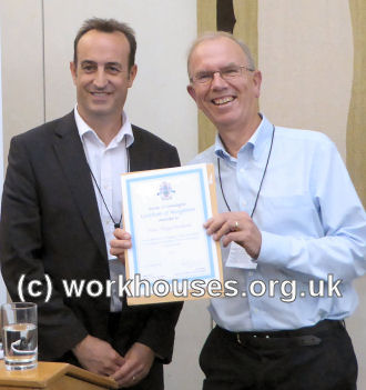 In 2015, I had the honour of being awarded the Society of Genealogists' prestigious 'Certificate of Recognition' for my 'dedication in compiling extensive information on workhouses and children's homes and making it widely available.' The award was presented by Dr Nick Barratt in conjunction with my talk 'Welfare before the Welfare State' at Westminster, part of the parliamentary 'Festival of Freedoms'.